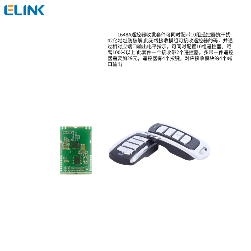 EL_1648A 系列是一款低成本,高性能的 FSK 無(wú)線(xiàn)透明數(shù)據(jù)收發(fā)模塊。此無(wú)線(xiàn)接收模組可接收遙控器的碼,并通過(guò)相對(duì)應(yīng)端口輸出電平指示,可同時(shí)配置10組遙控器。