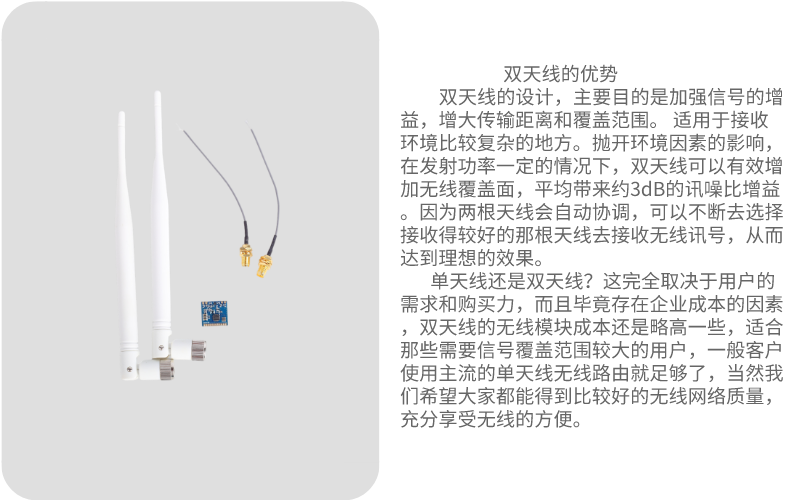 雙天線的設(shè)計(jì),主要目的是加強(qiáng)信號(hào)的增益,增大傳輸距離和覆蓋范圍。 適用于接收環(huán)境比較復(fù)雜的地方。拋開(kāi)環(huán)境因素的影響,在發(fā)射功率一定的情況下,雙天線可以有效增加無(wú)線覆蓋面,平均帶來(lái)約3dB的訊噪比增益。因?yàn)閮筛炀€會(huì)自動(dòng)協(xié)調(diào),可以不斷去選擇接收得較好的那根天線去接收無(wú)線訊號(hào),從而達(dá)到理想的效果。