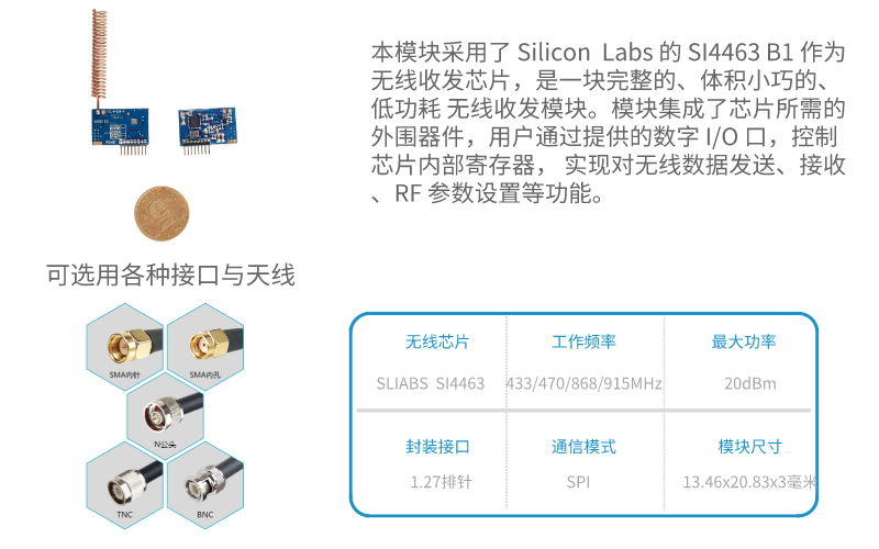 本模塊采用了 Silicon Labs 的 SI4463 B1 作為無(wú)線(xiàn)收發(fā)芯片,是一塊完整的、體積小巧的、低功耗 無(wú)線(xiàn)收發(fā)模塊。模塊集成了芯片所需的外圍器件,用戶(hù)通過(guò)提供的數(shù)字 I/O 口,控制芯片內(nèi)部寄存器, 實(shí)現(xiàn)對(duì)無(wú)線(xiàn)數(shù)據(jù)發(fā)送、接收、RF 參數(shù)設(shè)置等功能。