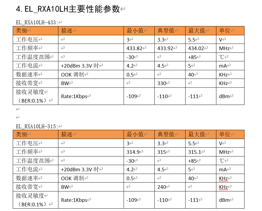 EL_RXA10LH是一款超外差OOK高性能無線接收模組。工作頻段可選為315MHz/433.92MHz。 EL_RXA10LH是超低功耗、高靈敏度、遠(yuǎn)距離通訊、高性價(jià)比的OOK 射頻接收模塊,適用于ISM 頻段無線應(yīng)用。具有抗干擾性好、可靠性高的特點(diǎn),即使在復(fù)雜干擾環(huán)境的情景使用,也不會對工作距離產(chǎn)生影響。該產(chǎn)品分為315MHz 和433.92MHz兩個(gè)工作頻率,支持0.5~40kbps 的數(shù)據(jù)率范圍,用戶只需要外加簡單的數(shù)據(jù)解碼電路,即可輕易實(shí)現(xiàn)無線產(chǎn)品的開發(fā)。主要應(yīng)用在遙控、家庭安全和告警、車庫和大門開啟、家庭自動化等。